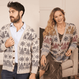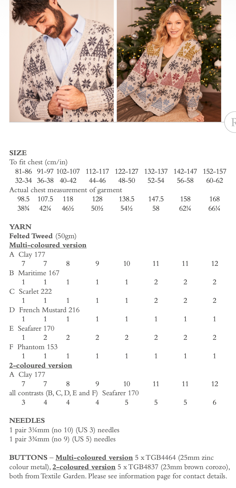 This longline unisex cardigan by Martin Storey is a wonderful festive knit. Pine trees and stylised snowflakes depict an almost magical forest scene on this all-over Fair Isle knit. Worked in either a two shaded version of Felted Tweed or multi-coloured, this classic v-neck is bordered with a traditional rib and button band fastening.