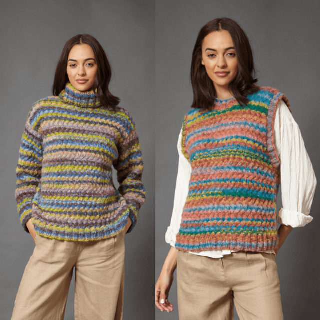 Knit a statement sweater and tank top with King Cole Flair Chunky. The yarn’s unique colour transitions and fluffy texture highlight simple stitches, giving these pieces a modern, eye-catching look that works beautifully for layering or wearing on their own.
