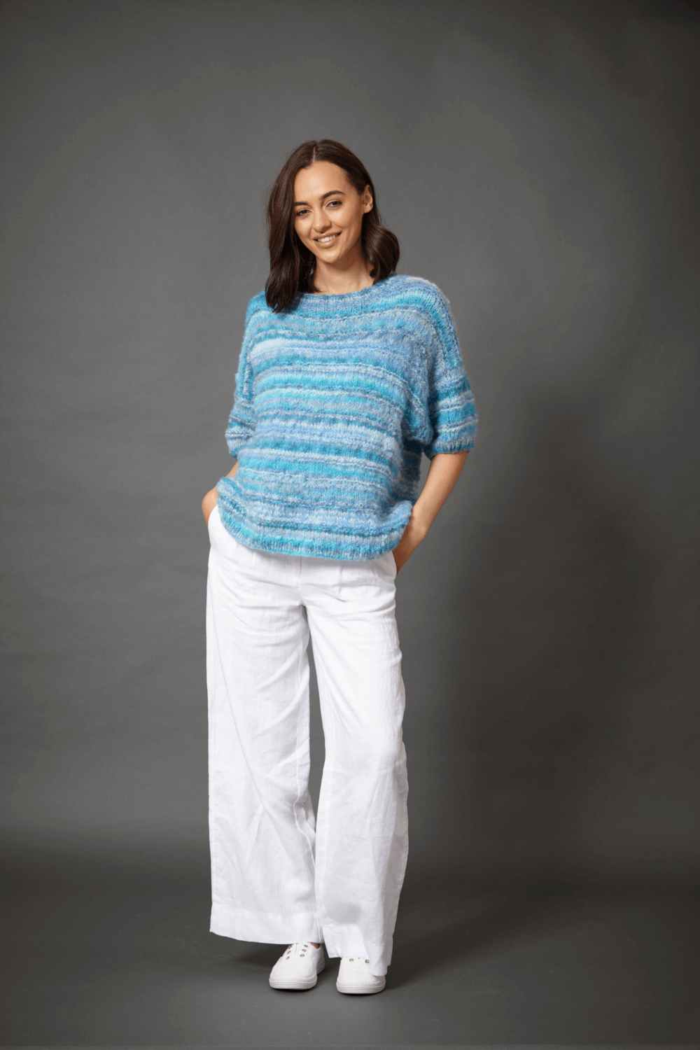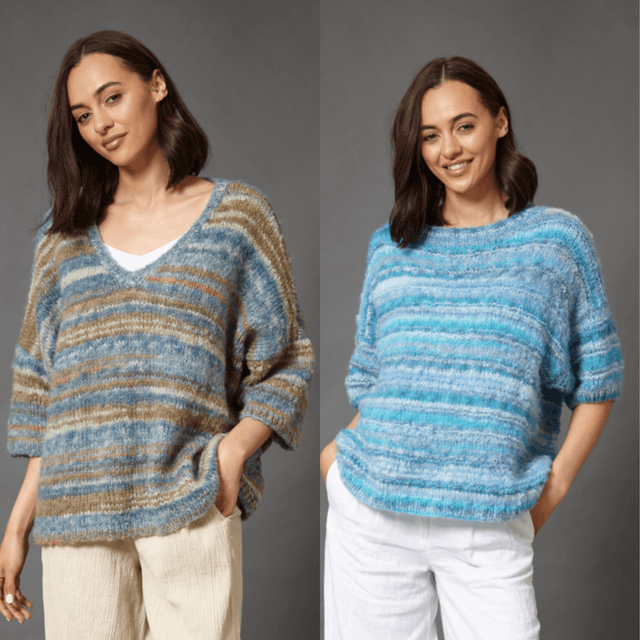 This knitting pattern includes two relaxed sweaters, one with a flattering V-neck and the other with a simple round neck. Knitted in King Cole Flair Chunky, the brushed yarn and soft stripes create effortless comfort and style, perfect for everyday wear.