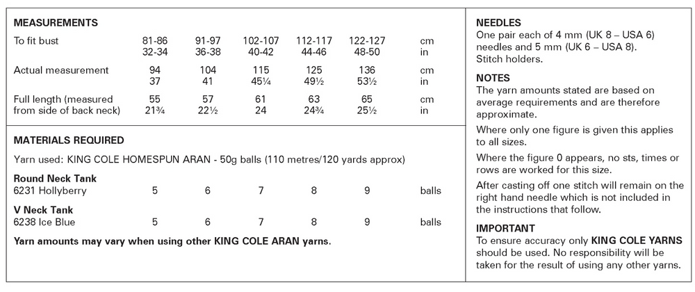 Knit two fabulous tank tops with this King Cole pattern! Choose between a cosy round neck or chic V-neck style, both crafted in gorgeous Homespun Aran yarn. Perfect for layering or solo wear—your wardrobe just got an upgrade!