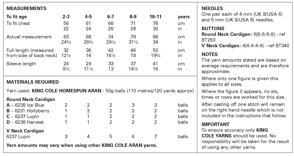 Craft delightfully snug cardigans for children using this King Cole Homespun Aran pattern! With its adorable textured design and beautifully soft yarn, you'll love creating these cosy layers. An ideal handmade gift that's pure joy to knit!