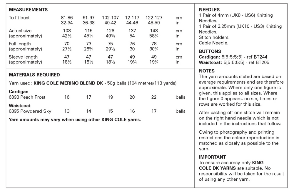 Elevate your wardrobe with this versatile King Cole pattern featuring a sophisticated cardigan and matching waistcoat. Perfect for showcasing luxurious Merino Blend DK yarn, these timeless pieces offer endless styling possibilities for the discerning knitter.