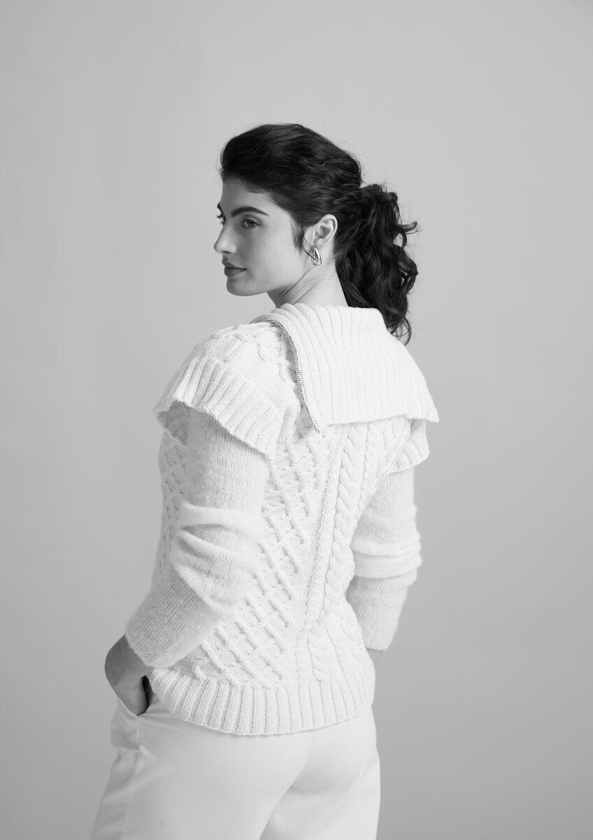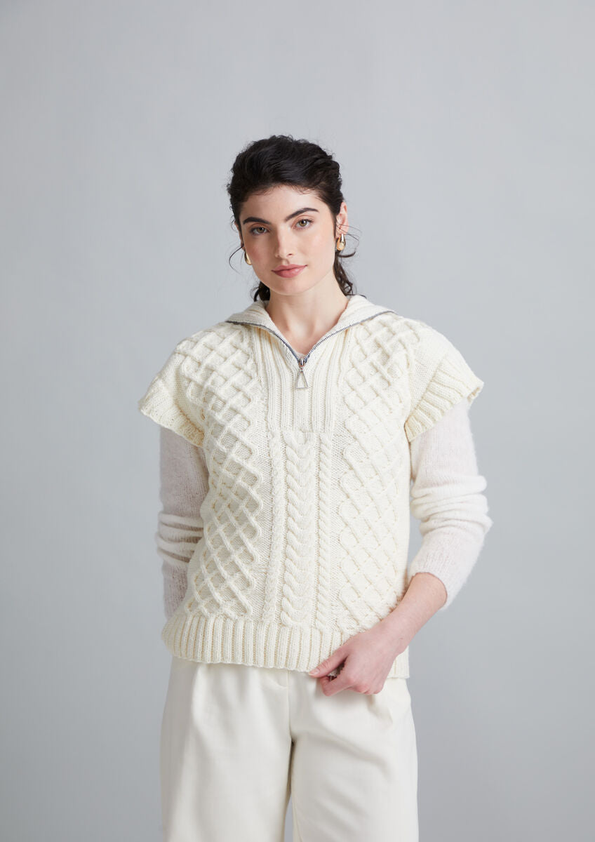 A modern cabled slipover knitted in Merino Soft, featuring short-row shaped cap sleeves and a zip-up high neck for added warmth and a contemporary edge. Wear it layered or on its own for effortless style and comfort.