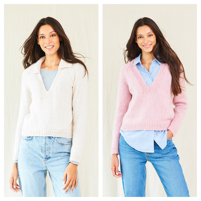 These sweaters feature an open neck line with knitted in boarders. We love the collar on the Oyster sweater, a simple sweater made elegant.