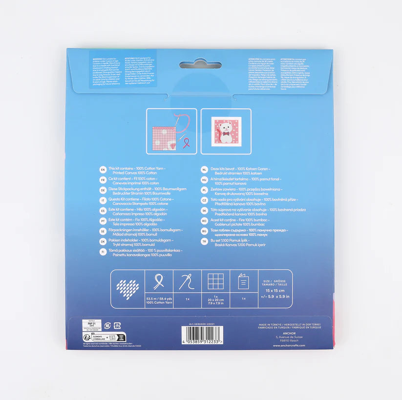 Kit includes: Cotton Yarn, Printed Canvas, Instruction Leaflet, Needle.