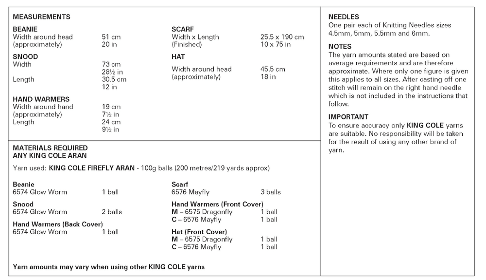 Bring your knitting to life with King Cole Firefly Aran Accessories Pattern 6450! Craft cosy, charming accessories with bold Aran designs that sparkle with every stitch. Perfect fun for creative hands!
