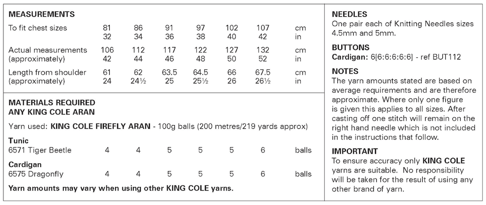 Create playful style with King Cole Firefly Aran Tunic and Cardigan Pattern 6449. Whimsical Aran designs bring texture and charm, making every stitch a joyful expression of your knitting flair.