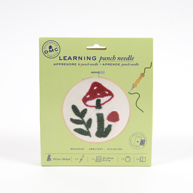 Discover the soothing effects of needlecrafts by learning punch needle. The scannable QR code inside this beginner's kit will take you step by step through the whole process of making this adorable mushroom design. The kit includes everything you need to complete the project.
