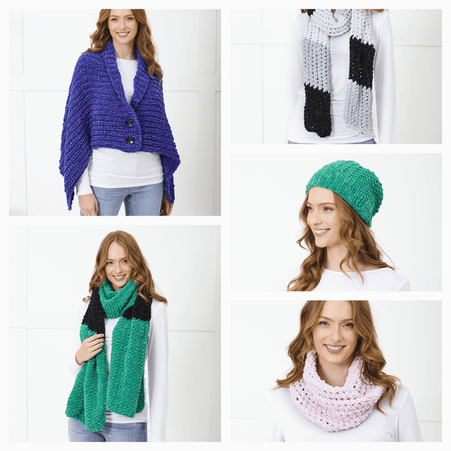 King Cole Yummy Glitz Chunky Scarves, Cowl, Shrug Wrap and Hat Knitting Pattern 6396 - Printed pattern in the post is backordered and will ship as soon as it is back in stock.