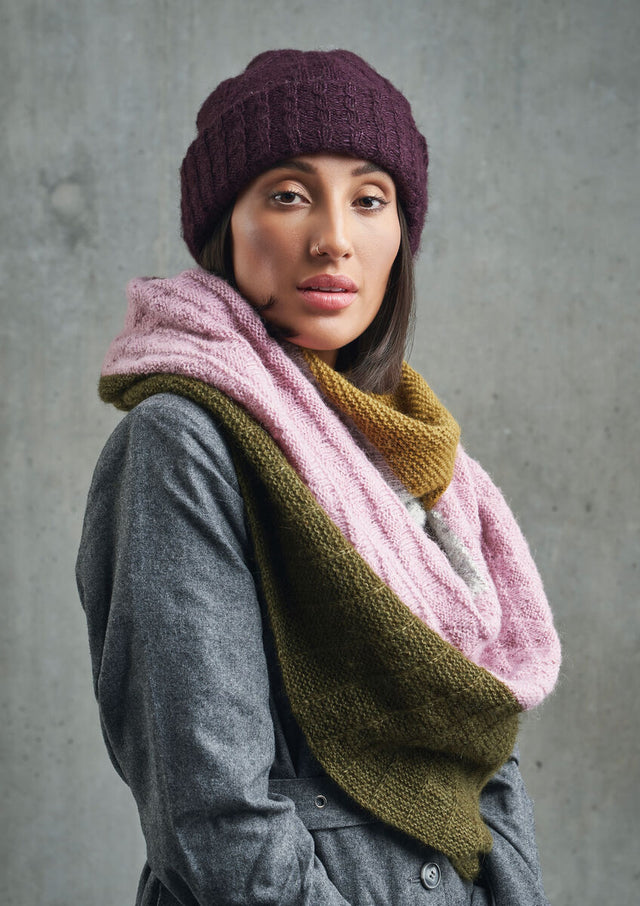Knit this women's textured hat from My London. A design by Georgia Farrell using the gorgeous Alpaca Classic 57% Alpaca 43% Cotton. With geometric patterning and a contrast cabled rib edging this knitting pattern is suitable for the intermediate knitter.