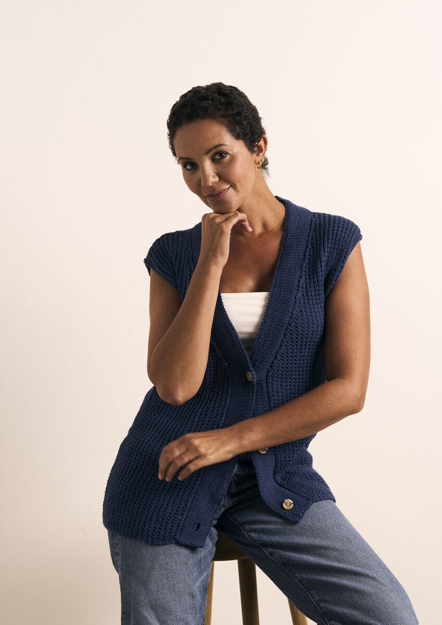 Lisbet is an open vest-style cardigan featuring a textured stitch design and a deep v-neckline. Its relaxed, open-front style makes it a versatile layering piece. The textured detailing adds interest, while the buttons serve both a functional and decorative purpose. Modern and stylish and knitted using MODE Cotton DK, Lisbet transitions effortlessly between casual and smart outfits.
