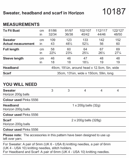 You will need: For Sweater: A pair of 5mm (UK 6 - USA 8) knitting needles, a pair of 6mm (UK 4 - USA 10) knitting needles, stitch holders. For Headband and Scarf: A pair of 6mm (UK 4 - USA 10) knitting needles.