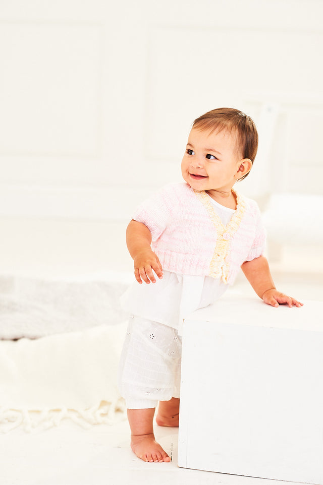 A lovely long and short sleeved cardigan set are featured in pattern 9899. The long sleeved option is knitted in stocking stitch with ribbed edging while the short sleeve option has a contrast colour border to add that little bit of extra detail. Both are V-neck cardigans, just perfect for your little rays of sunshine.
