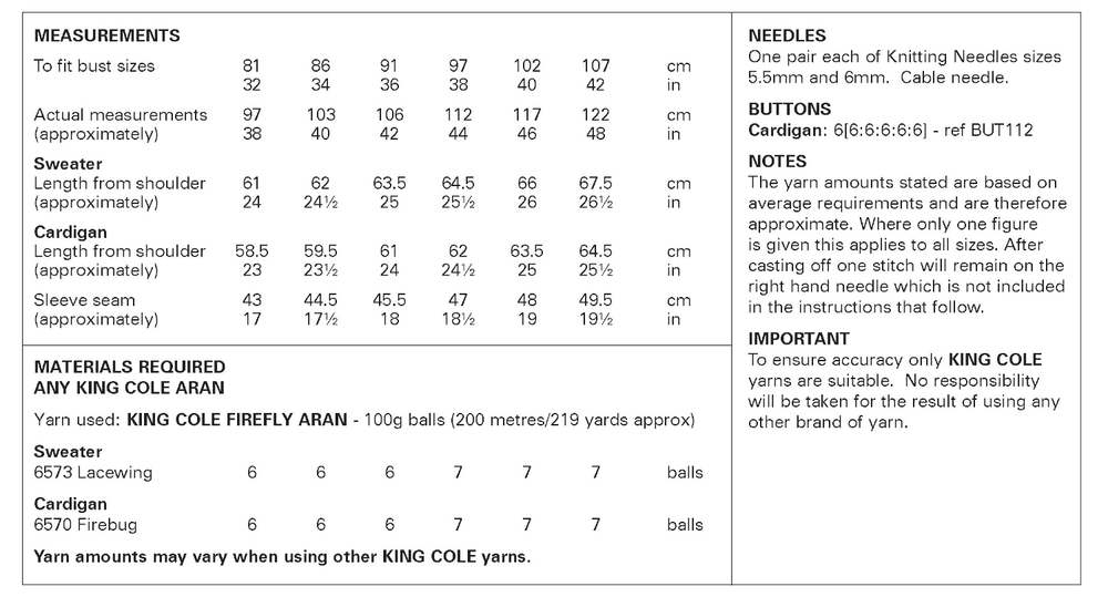 Craft bold style with the King Cole Firefly Aran Sweater and Cardigan Pattern 6447. Dare to knit intricate textures that stand out—perfect for creating fearless, timeless knitwear with striking detailing.