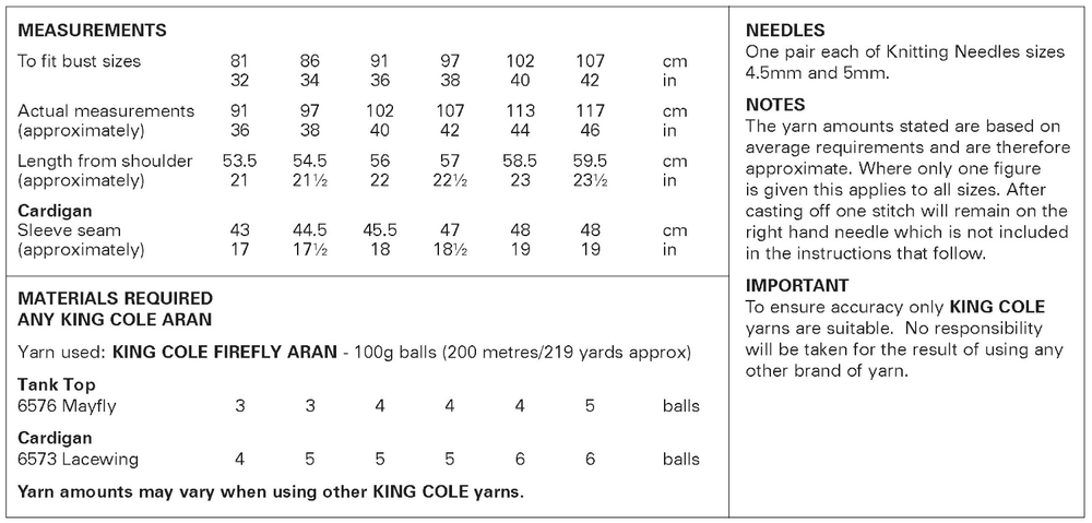 Take on the challenge with King Cole Firefly Aran Pattern 6445—bold tank top and cardigan designs that push your knitting skills to new heights. Transform yarn into striking, unforgettable fashion statements.