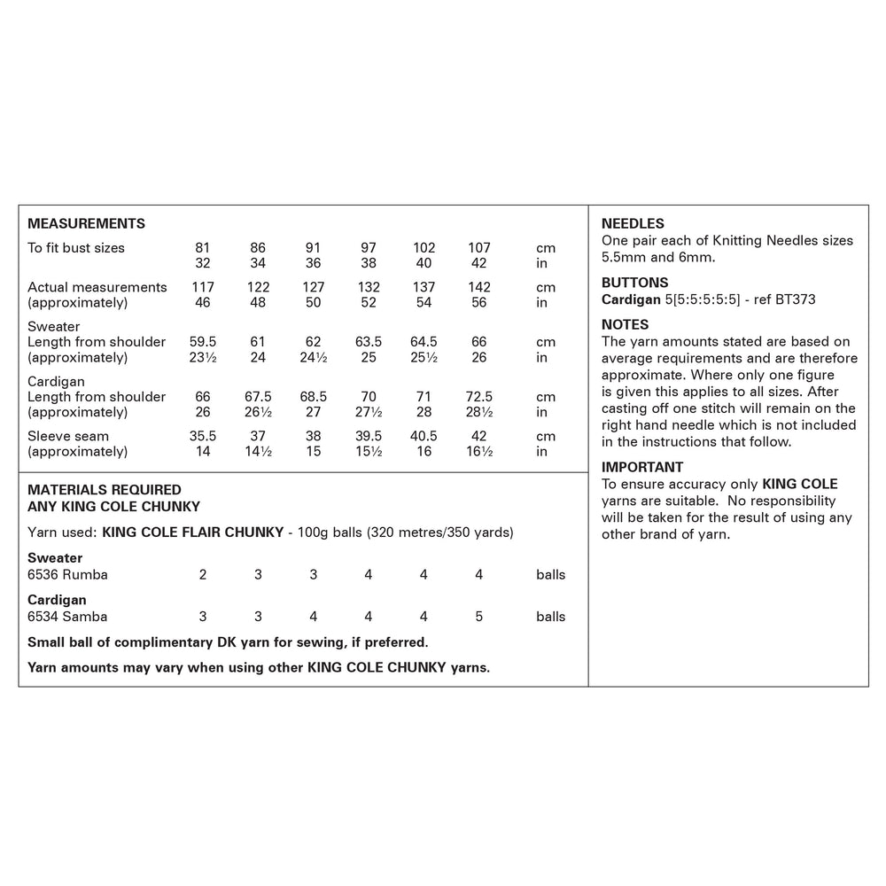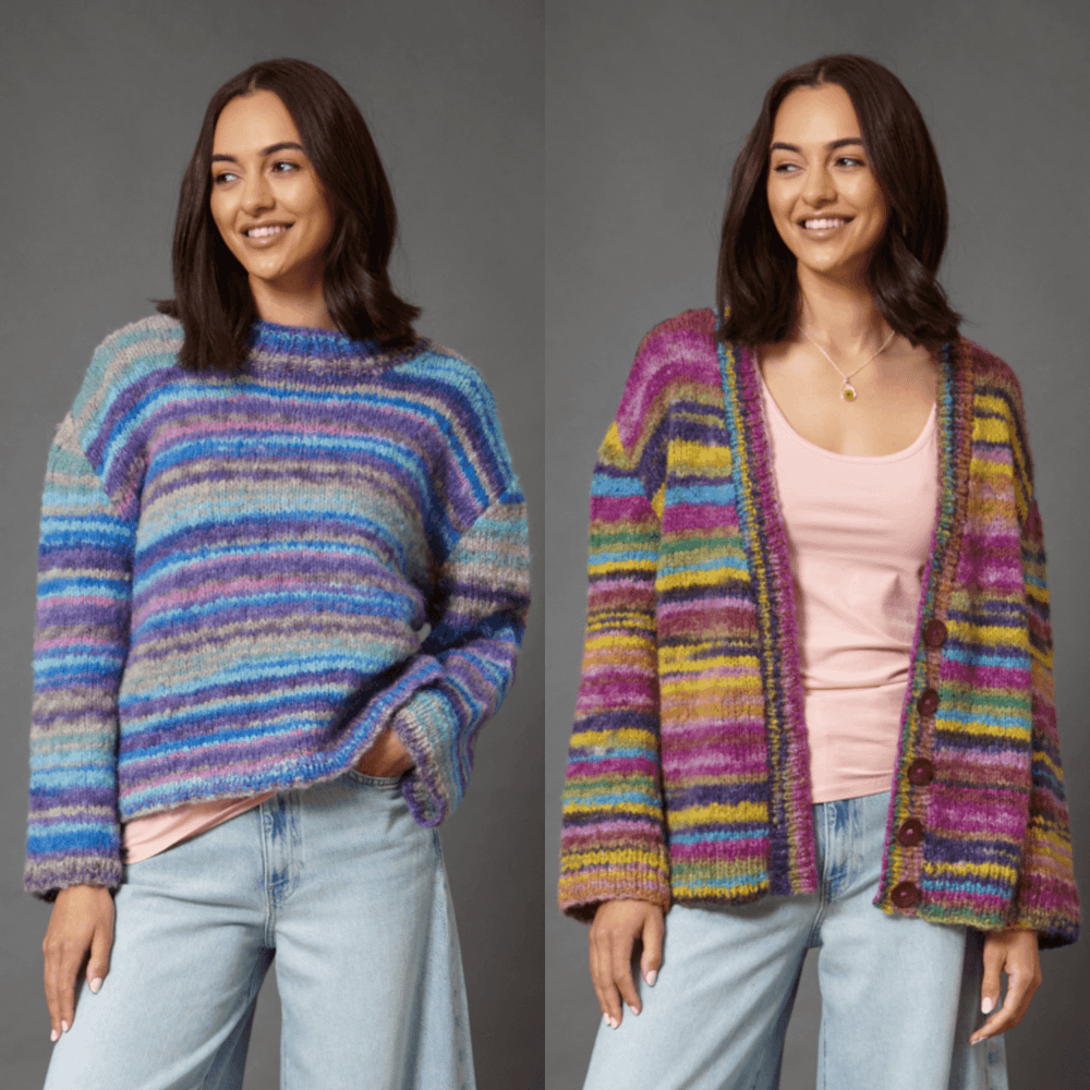 This knitting pattern features a relaxed sweater and a buttoned cardigan, both knitted in King Cole Flair Chunky. The yarn’s soft brushed texture and vibrant self-striping shades create bold, eye-catching garments that are warm, comfortable, and perfect for layering through the seasons.