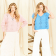 These lovely tops in Organic Cotton are part of our easy knit range and feature a simple lace trellis pattern on a mainly stocking stitch design. The long sleeve jumper has two rows of lace eyelets at the cuffs. The short sleeve top is made in just two pieces and both designs have a garter stitch neck trim.