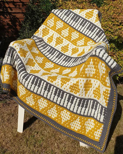 This inset mosaic crochet blanket was inspired by the Neil Young song ‘Heart of Gold’ Inset mosaic crochet is much easier to do than it may seem. There are no colour changes within rows - the pattern is created by leaving ch-sps in rows using the first colour, and these are filled in with trs in the next RS row in a contrasting colour, leaving the ch-sps unworked behind.
