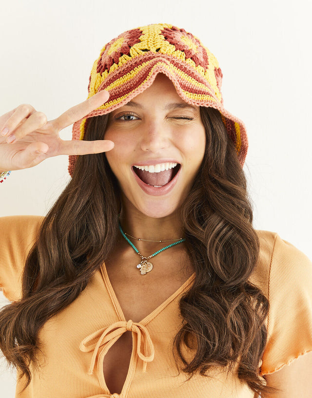 Bucket hats are essential festival wear, a simple accessory thats bang on trend this Summer. To create this sunflower-inspired bucket hat, you will crochet granny squares for the crown and sides of the hat and then stitch striped double crochet for the brim.